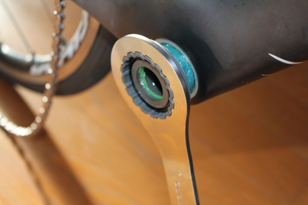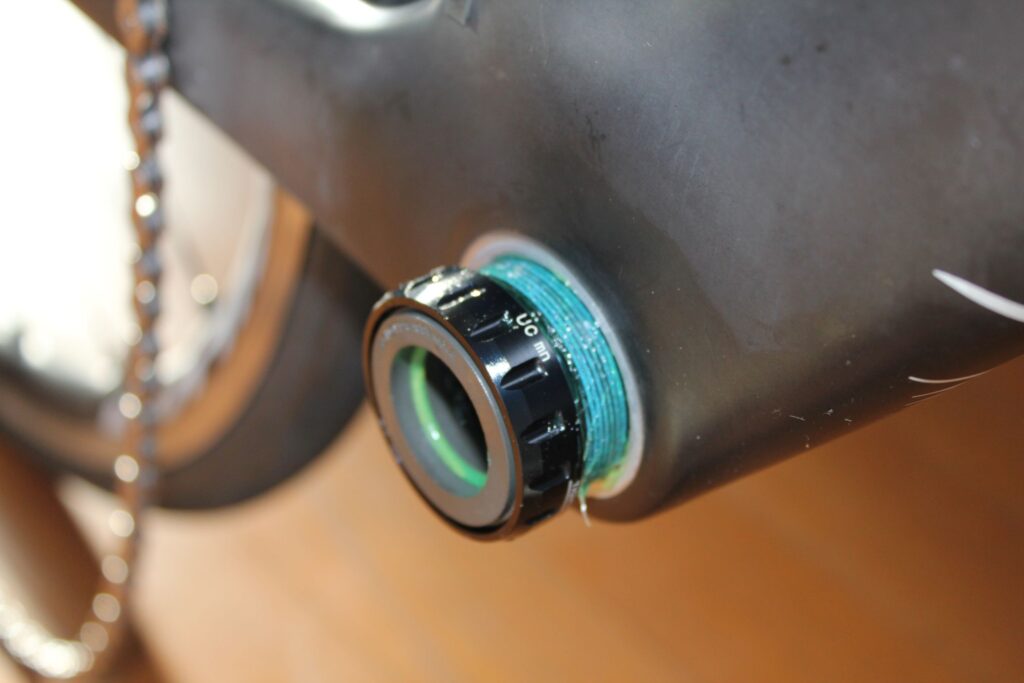 BBは斜めにならない様に、最初は手で優しくねじ込んで行き、ゆるみ止めが効いて固くなった所で工具を使って締め込みます。