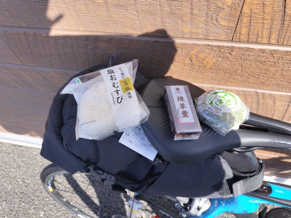 あまり休み過ぎると温まった筋肉が冷えて動き出しが辛くなるので、手早くおにぎりだけ食べて他はトップチューブバッグに収納し走りながら食べます。